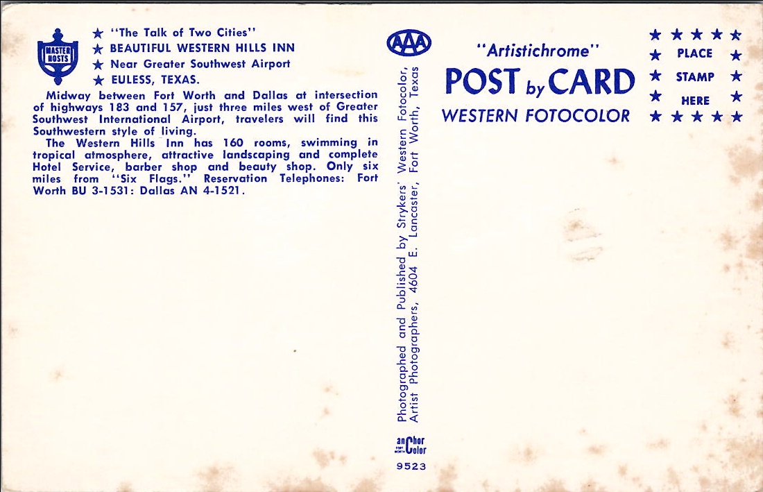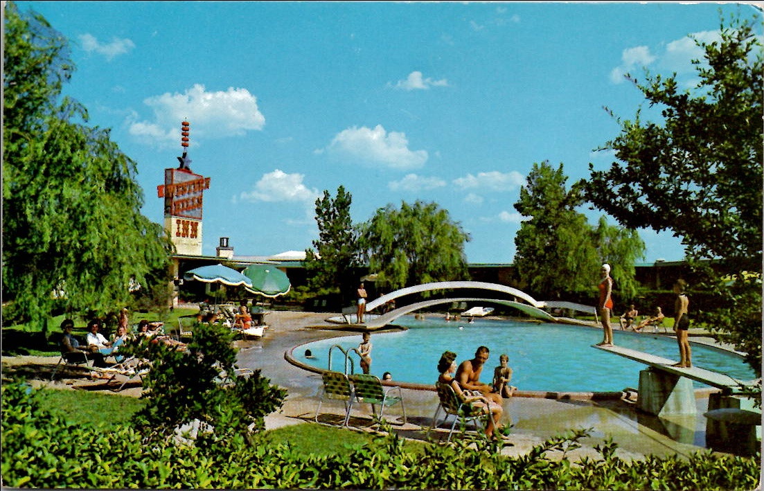 A vintage postcard of the Skyview Motel in Liberal, Kansas. Guests relax by the pool on a hot summer day.
