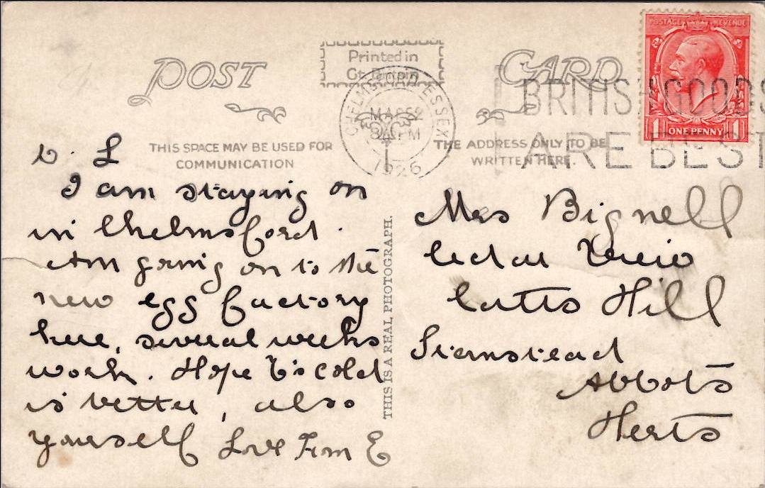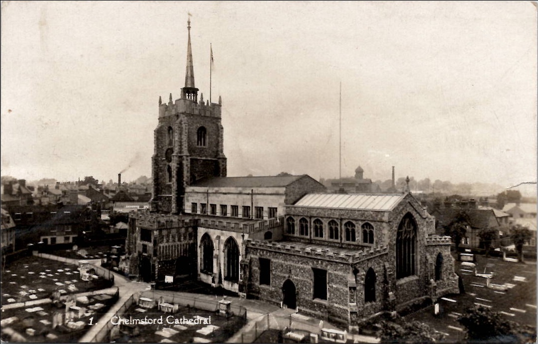 A black and white postcard of Chelmsford Cathedral, a large and imposing building with a tall spire and buttressed walls.