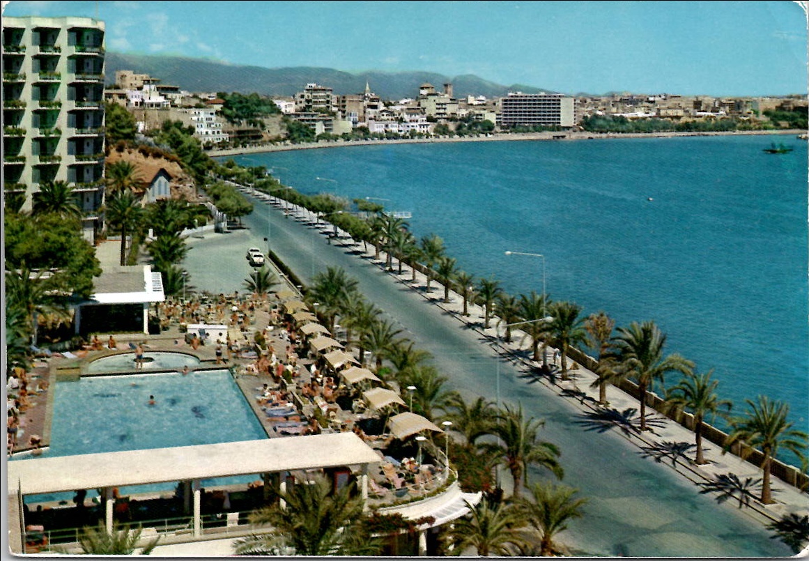 Palm trees line a road that runs parallel to the Mediterranean Sea in Tunisia. In the background are tall apartment buildings and a mountainous landscape.