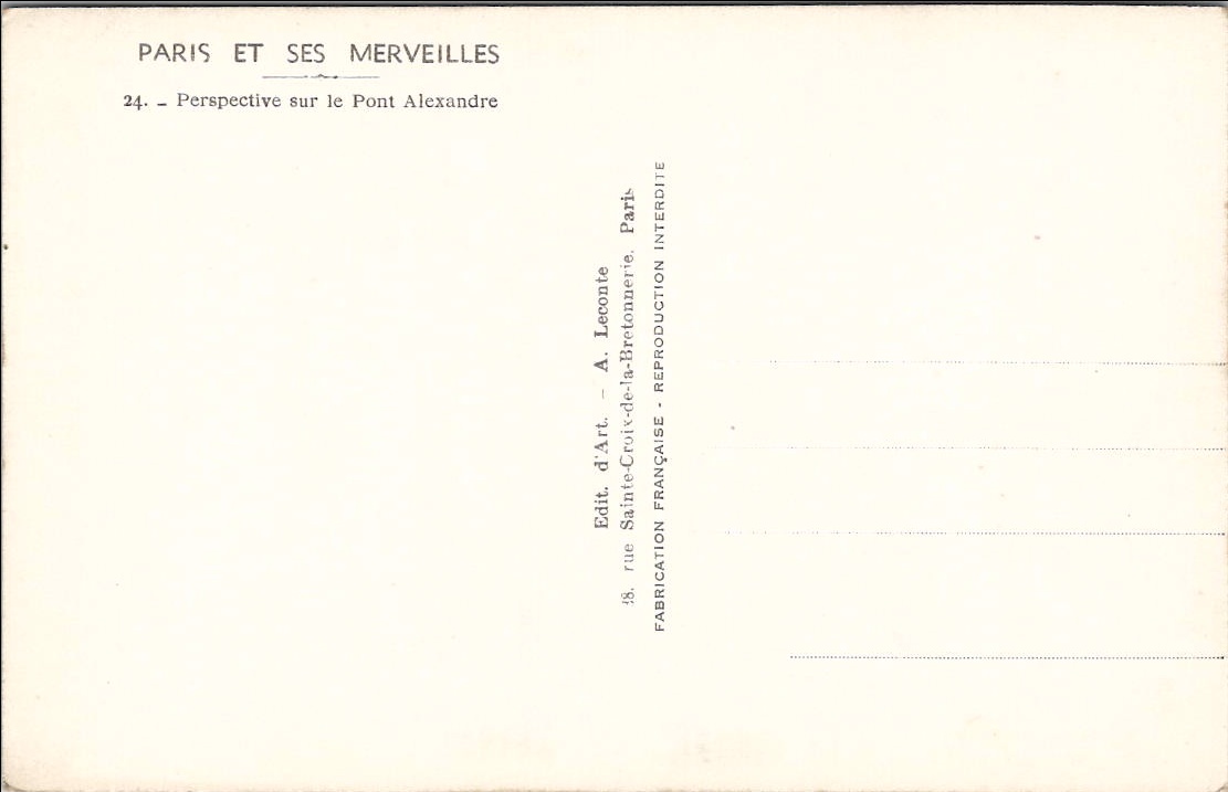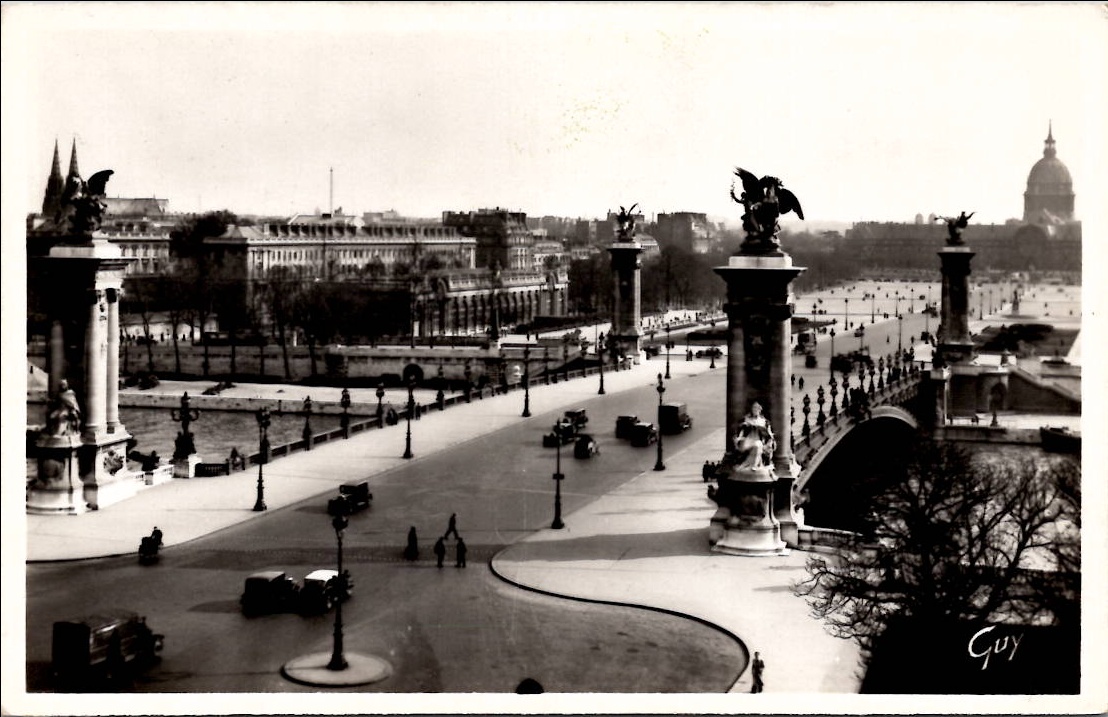 This black and white postcard shows the Pont Alexandre III in Paris, France. The bridge is decorated with ornate statues and there are buildings and trees in the background.