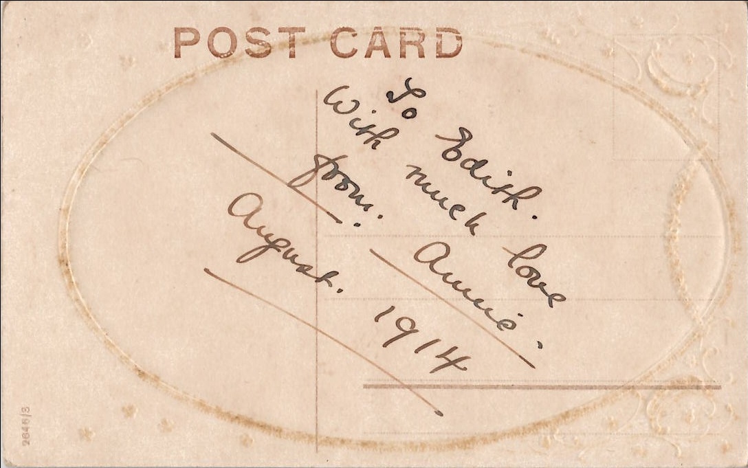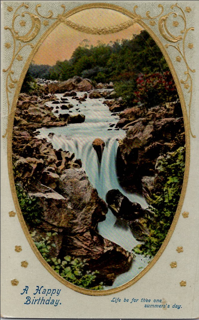 The postcard has an oval picture of a waterfall with a decorative gold frame. It has a caption at the bottom that reads “A Happy Birthday. Life be to thee one summer’s day.”