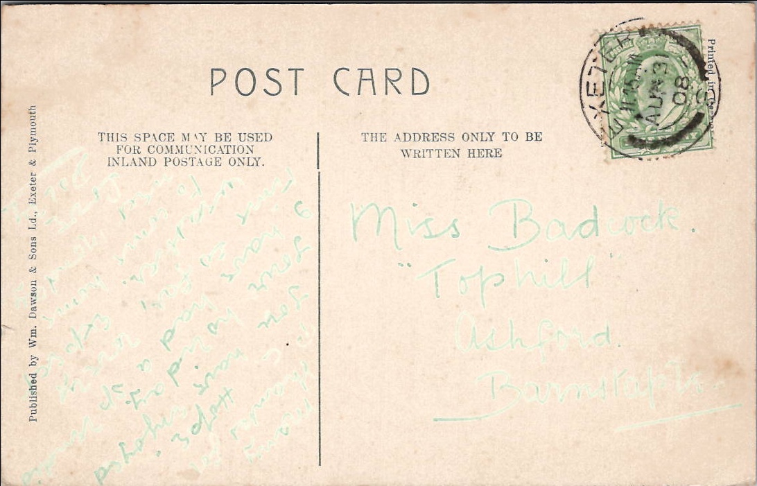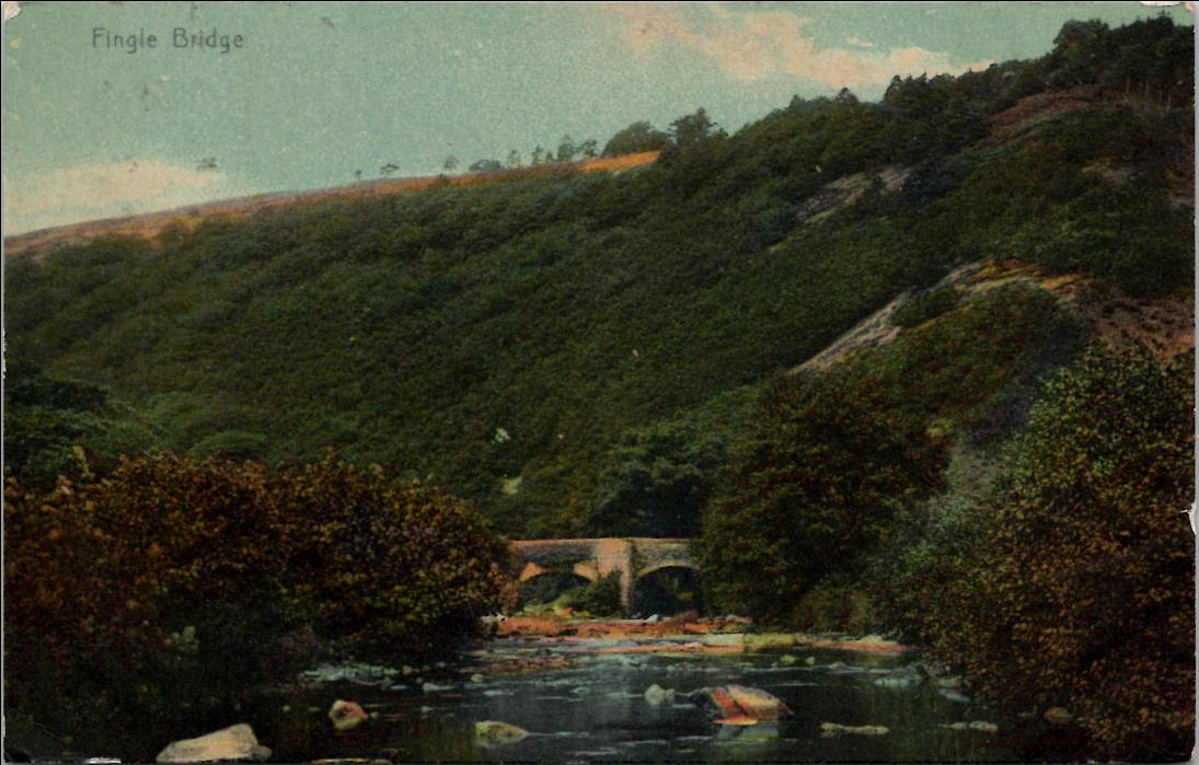 The postcard shows a bridge over a river in a valley. The bridge is made of stone and has a single arch. The river is surrounded by trees and the valley is covered in greenery.