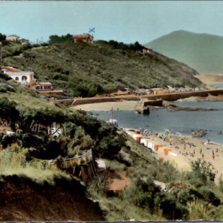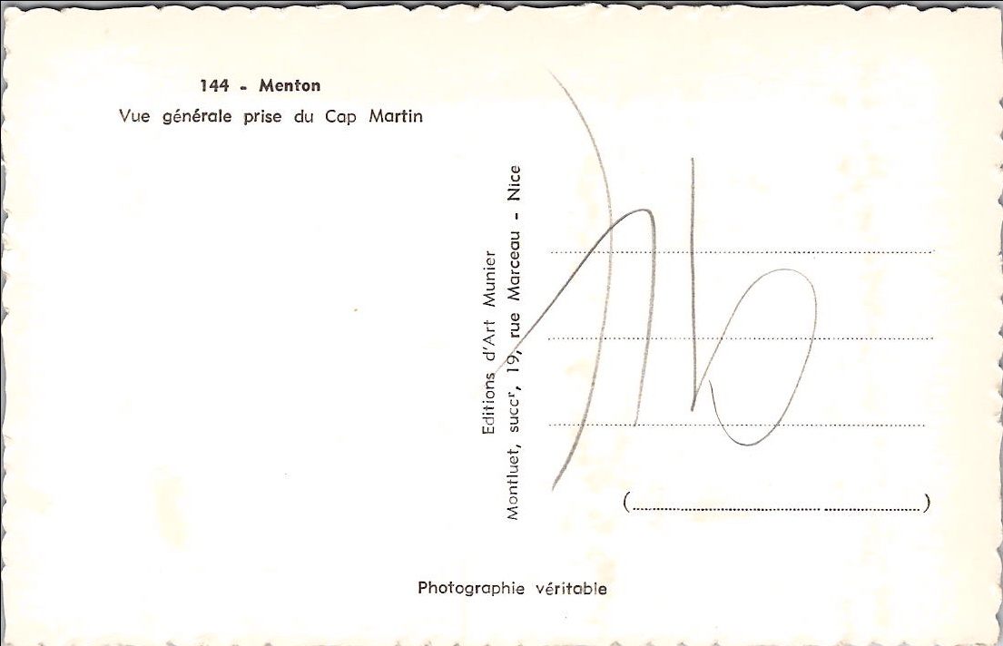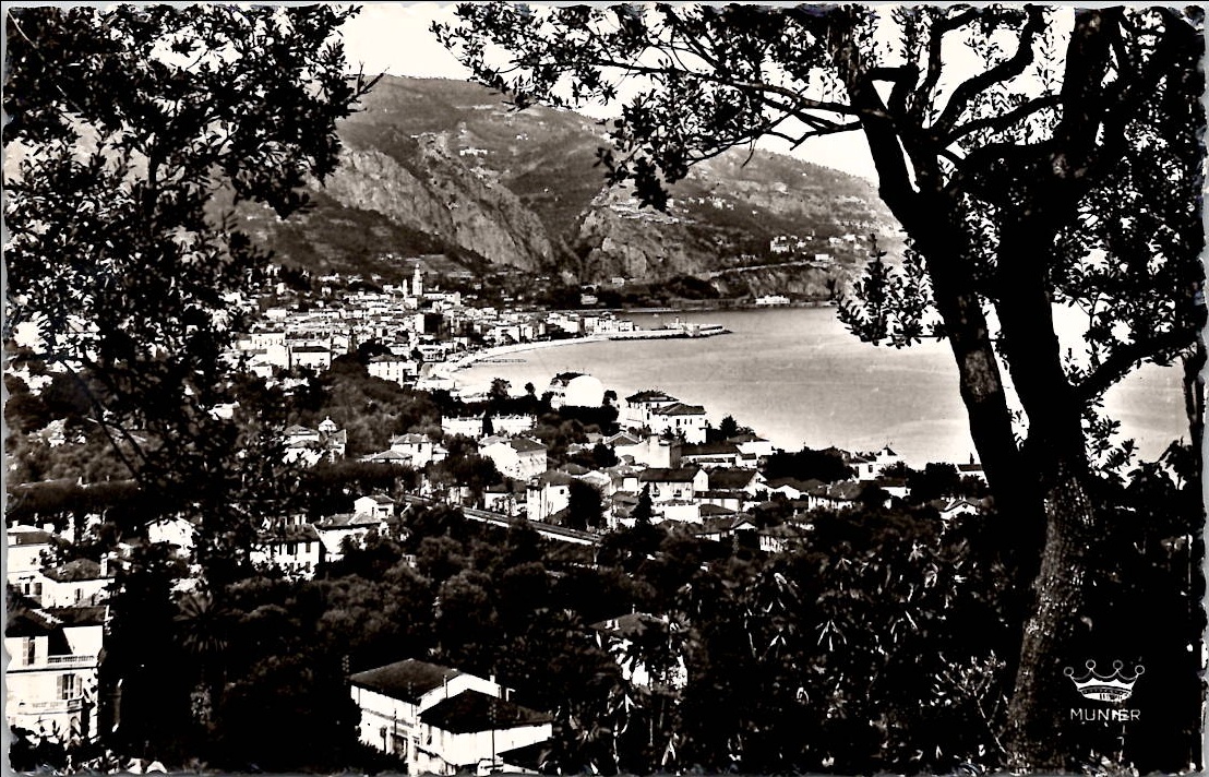 This black and white postcard shows a view of the town of Menton, France, from above. The town is nestled on the coast of the Mediterranean Sea, with the Alps mountains rising up in the background.