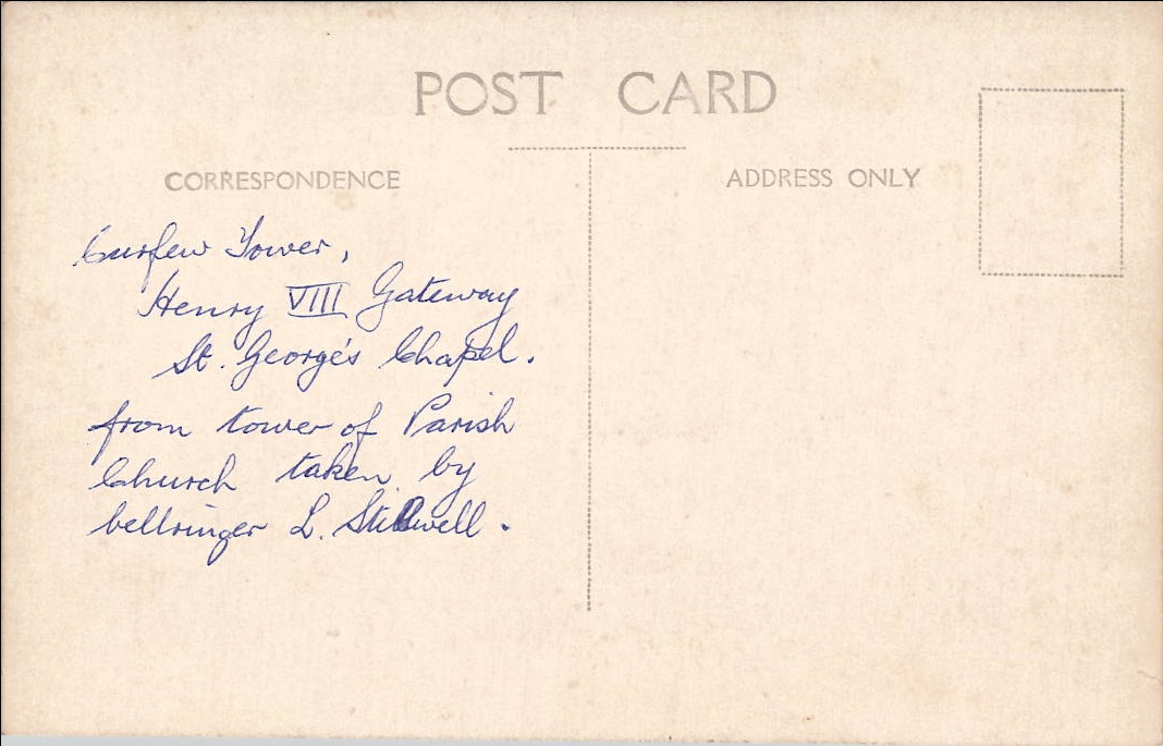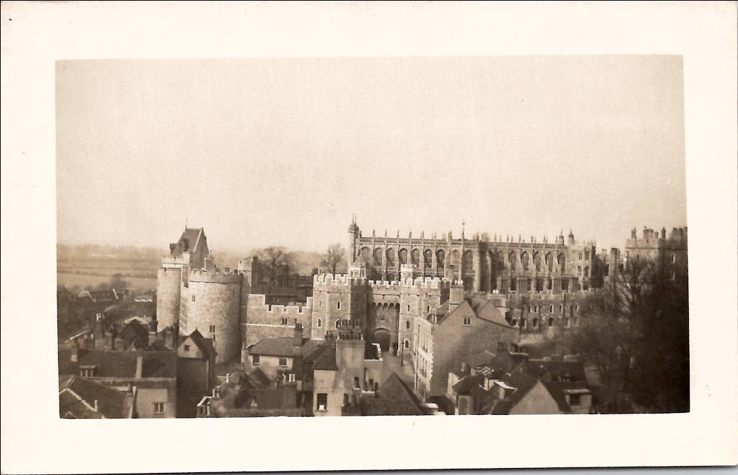 A black and white picture of Windsor Castle, taken from a high angle. The castle is made of stone and has a large tower.