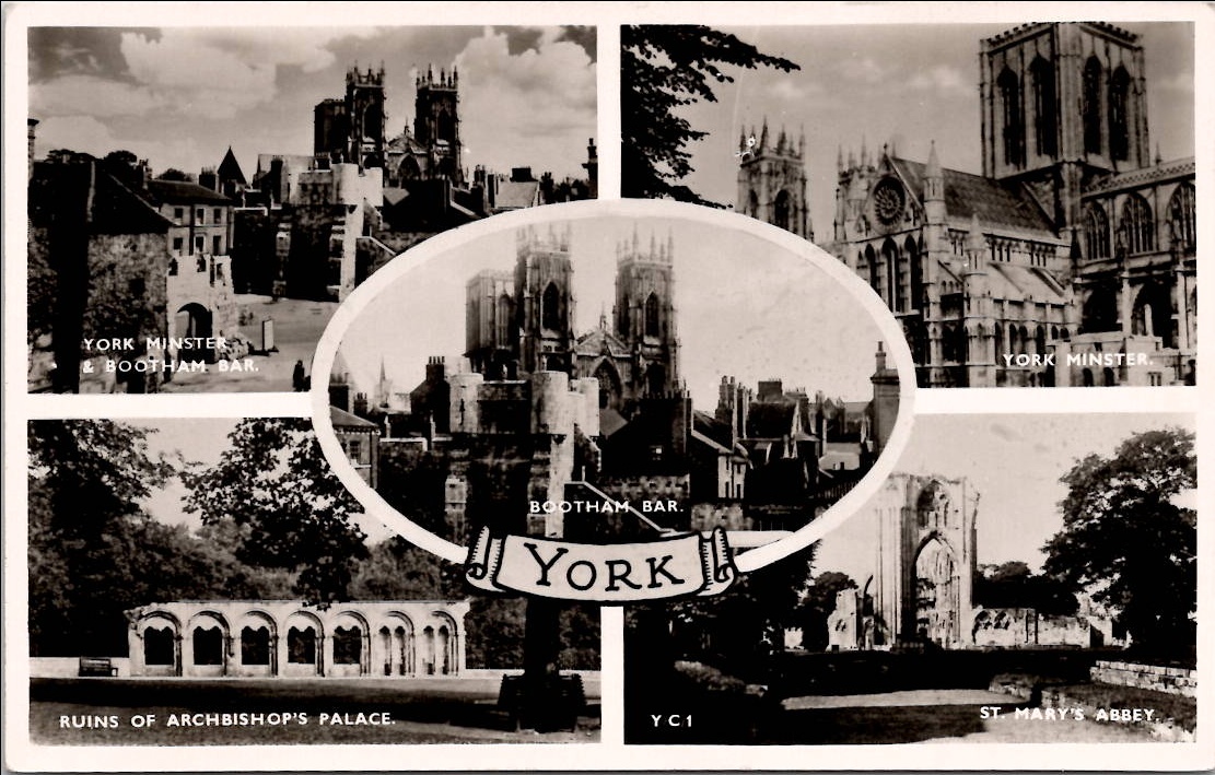 A black and white postcard of York, England, featuring York Minster, Bootham Bar, the ruins of Archbishop’s Palace, and St Mary’s Abbey.