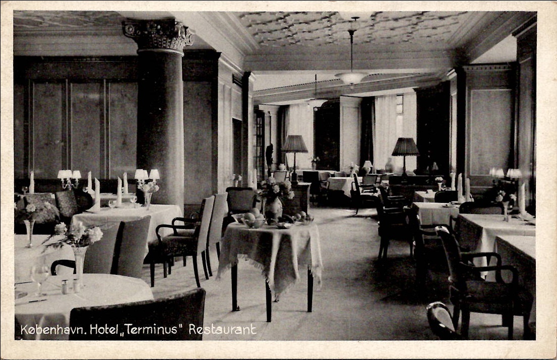 A black and white photo of the dining room of the Terminus Hotel in Copenhagen, Denmark.