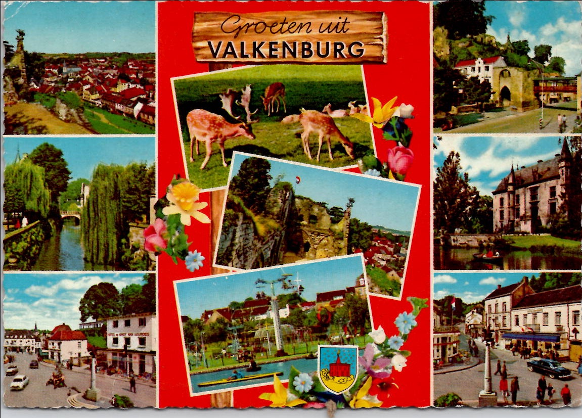 A postcard from Valkenburg, Netherlands, showing the castle, a river and some deer.