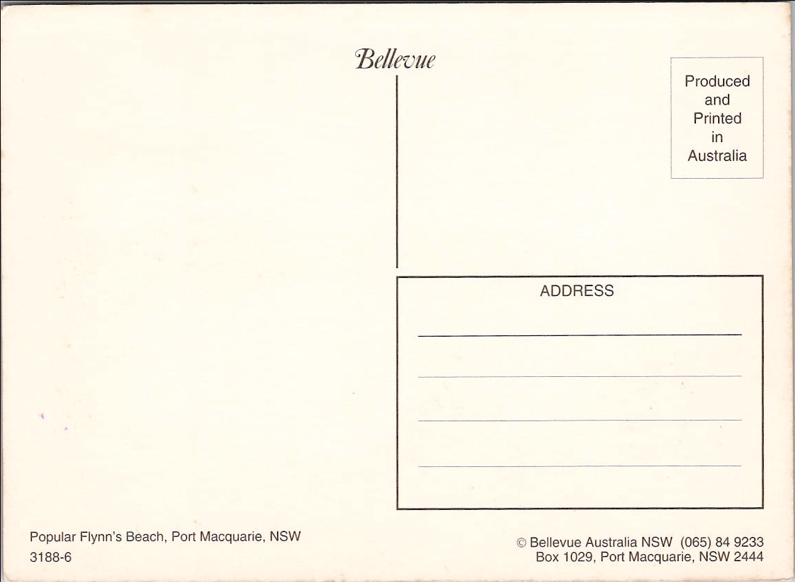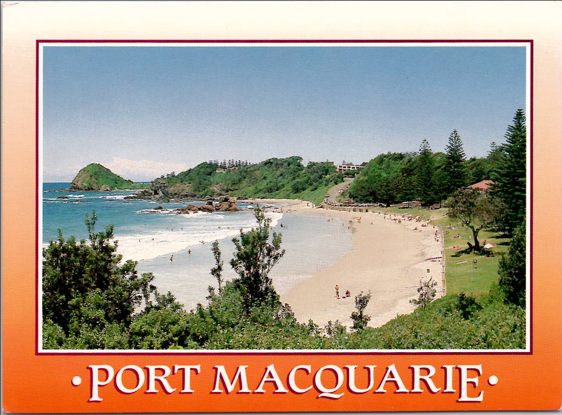 A view of the beach at Port Macquarie, New South Wales, Australia, showing the Pacific Ocean, a sandy beach, and trees on the headland.