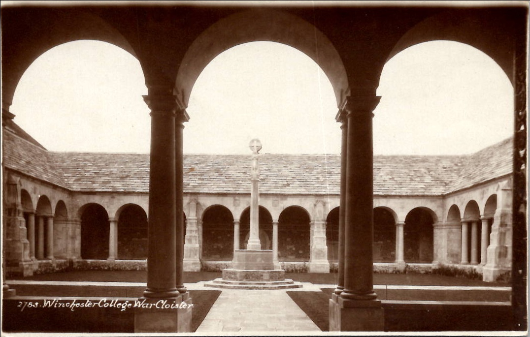 A black and white photo of the Winchester College Cloister showing the courtyard surrounded by arched walkways.